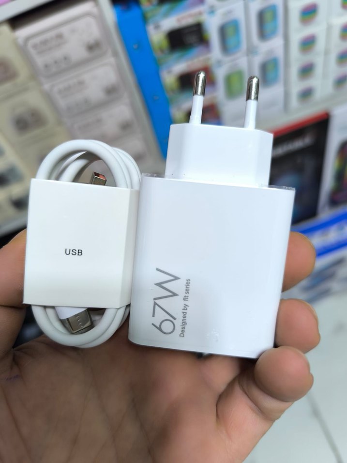 67W güç çıkışlı beyaz telefon şarj adaptörü ve USB kablosu, hızlı şarj ve kompakt tasarım sunar. ⚡