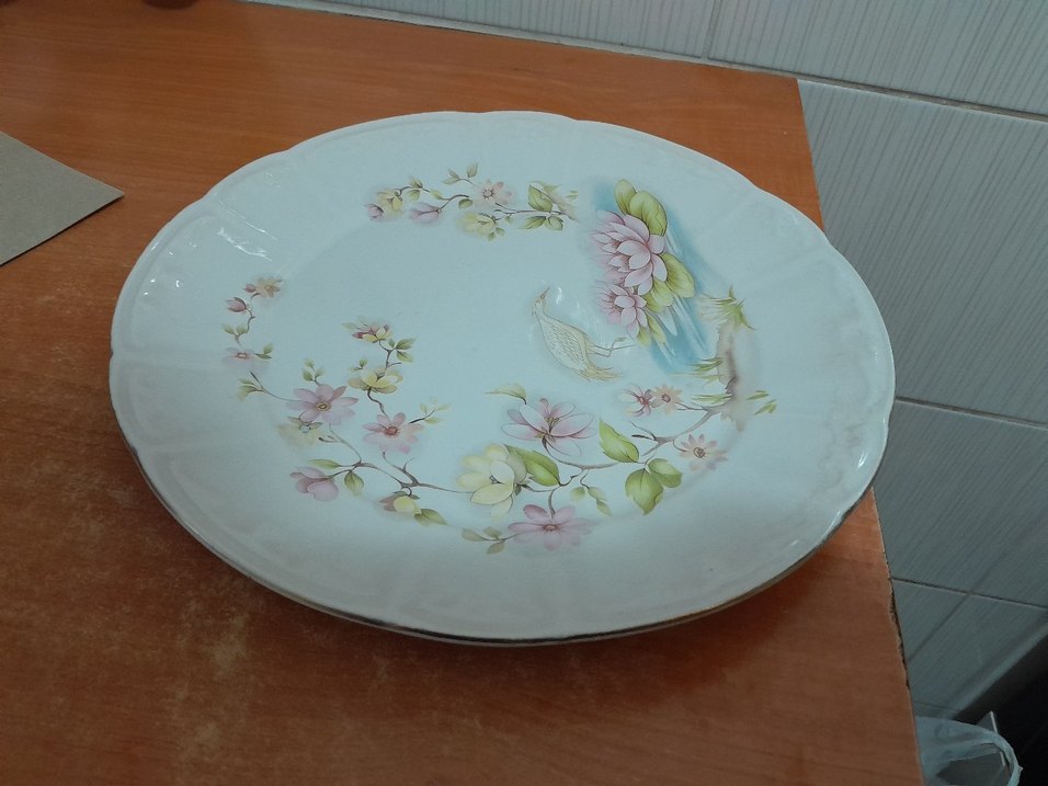 6 adet kucuk pasta tabagi 1adet buyuk servis tabagi buyuk tabagi 27 cm kucuk tabaklar18 cm hic kullanilmadi takim 35 senelik hic kusuru yok