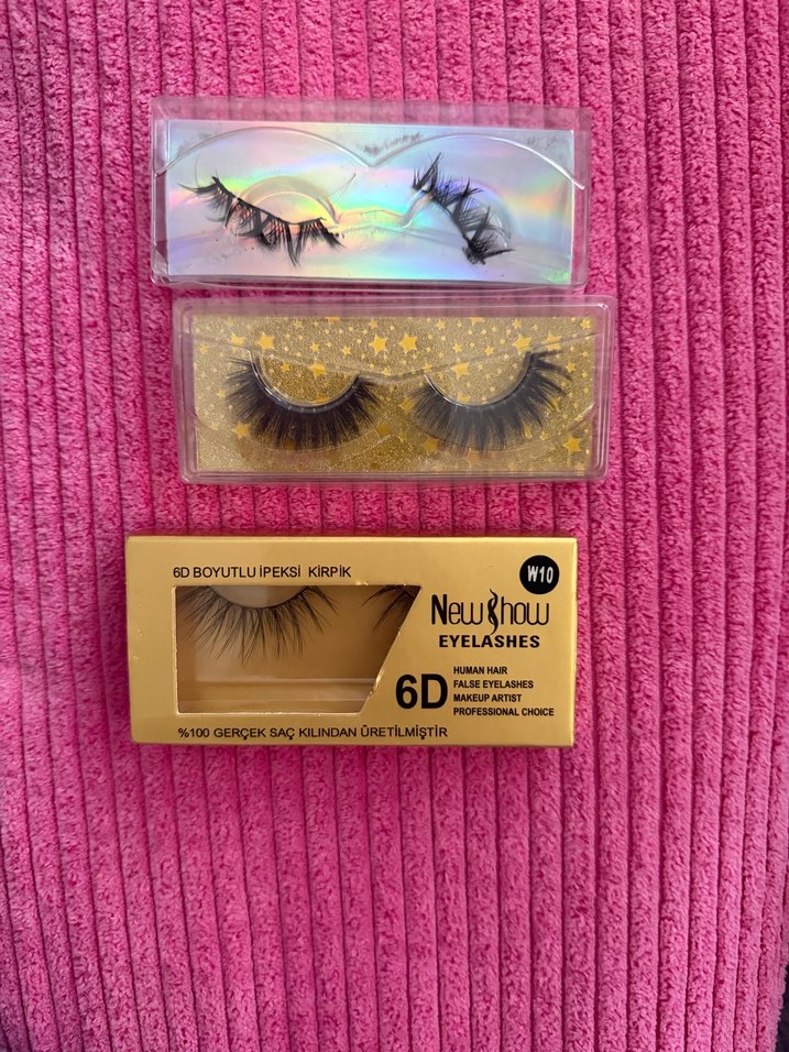 6D efektiyle parlak altın renkli, %100 gerçek saçtan üretilmiş Newghow marka takma kirpikler. ✨