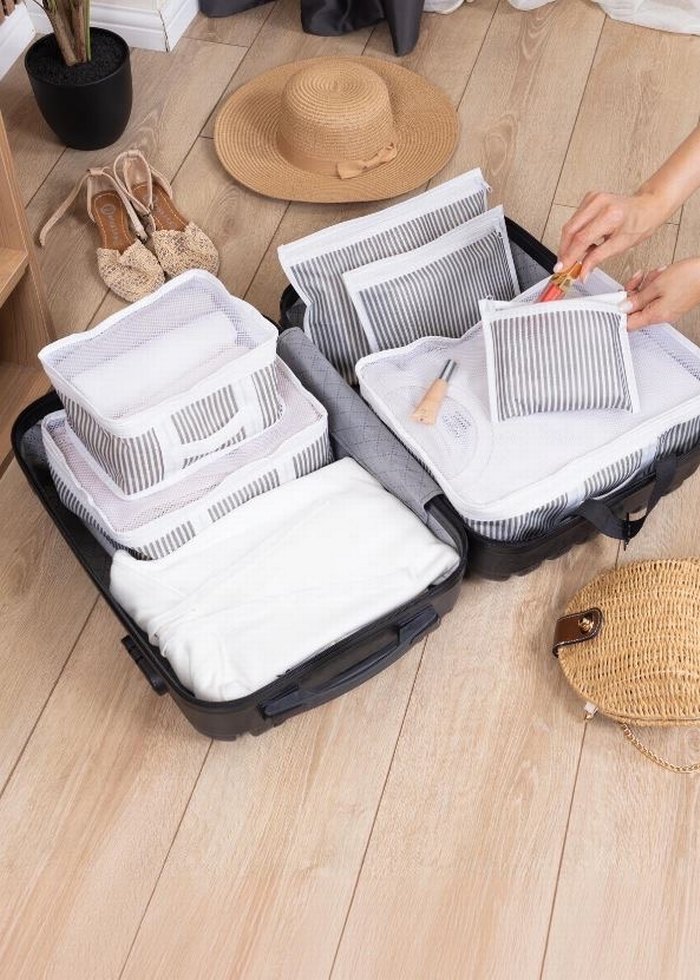 Gri beyaz renklerde, çizgili desenli çoklu valiz düzenleyici set, seyahat sırasında bavulunuzu düzenli tutar. 6’lıdır