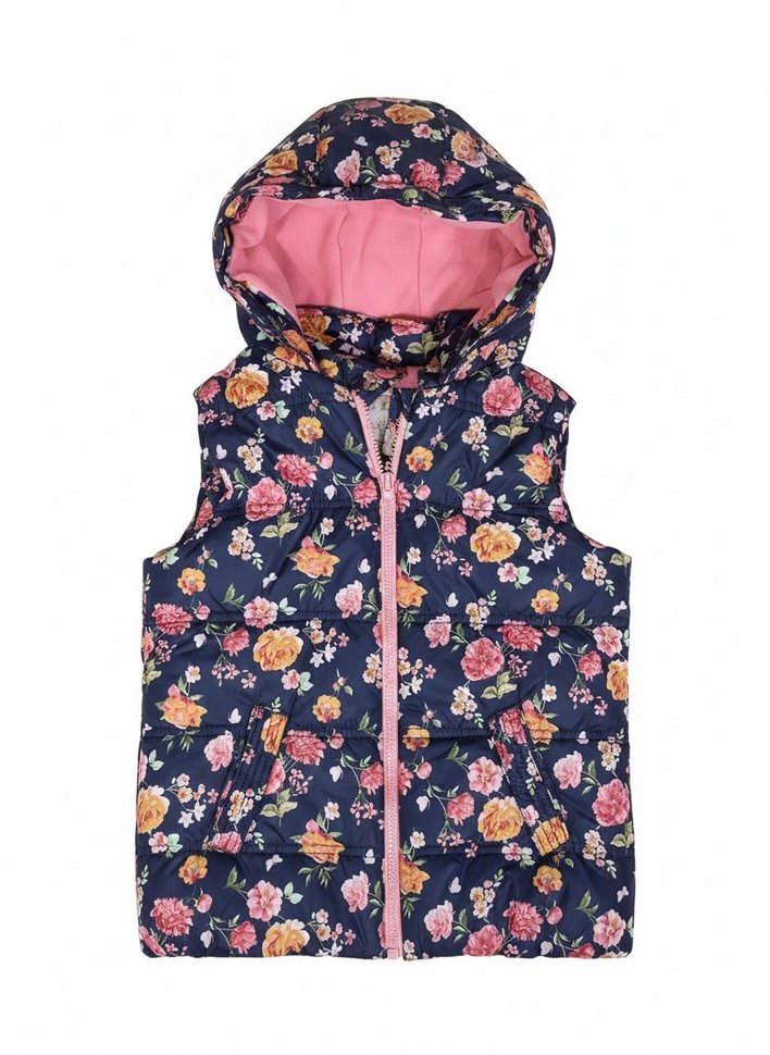 Çiçek desenli kapüşonlu kız yeleği, fermuarlı ve cepli. Sentetik kumaştan üretilmiş, sokak stiline uygun, kolsuz ve vücuda oturan tasarım.