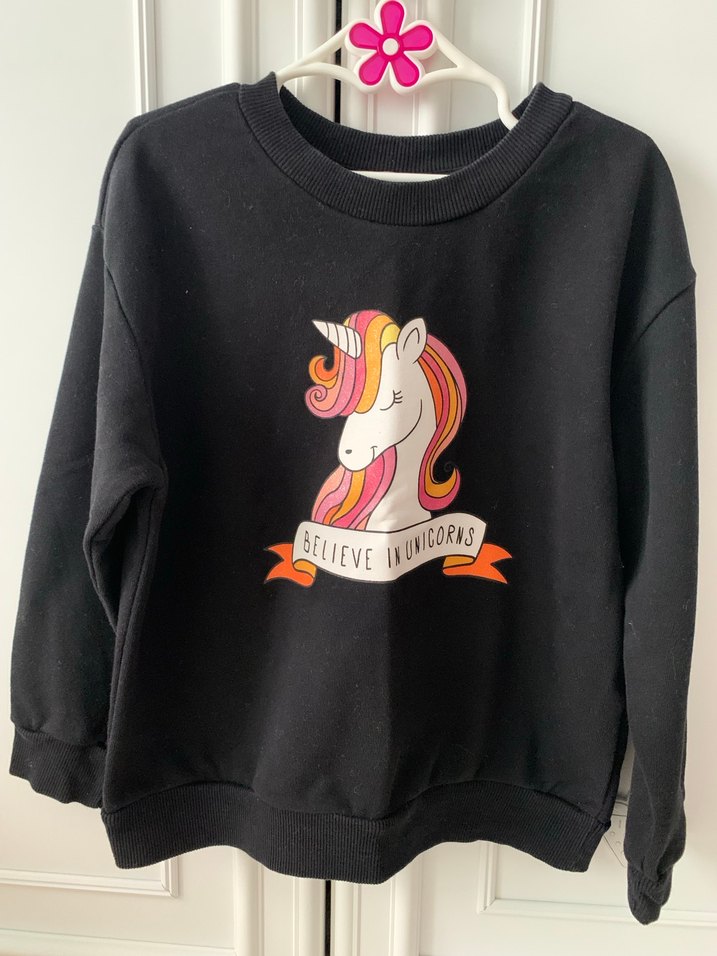 Siyah kız çocuk sweatshirt, uzun kollu ve yuvarlak yaka. Yumuşak kumaştan, renkli unicorn baskılı ve "Believe Unicorns" yazılı. 1-2 defa giyildi temiz ürün