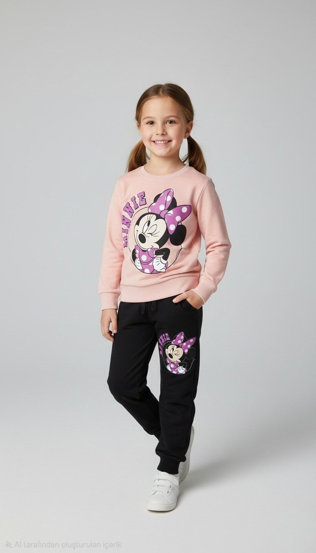 Kız çocukları için bol kesim, pastel pembe polar üst ve siyah pantolonlu eşofman takımı. Üstü yuvarlak yaka, uzun kollu ve Minnie baskılıdır. Pantolonda uyumlu Minnie baskısı ve cırt cırt detayı bulunur.