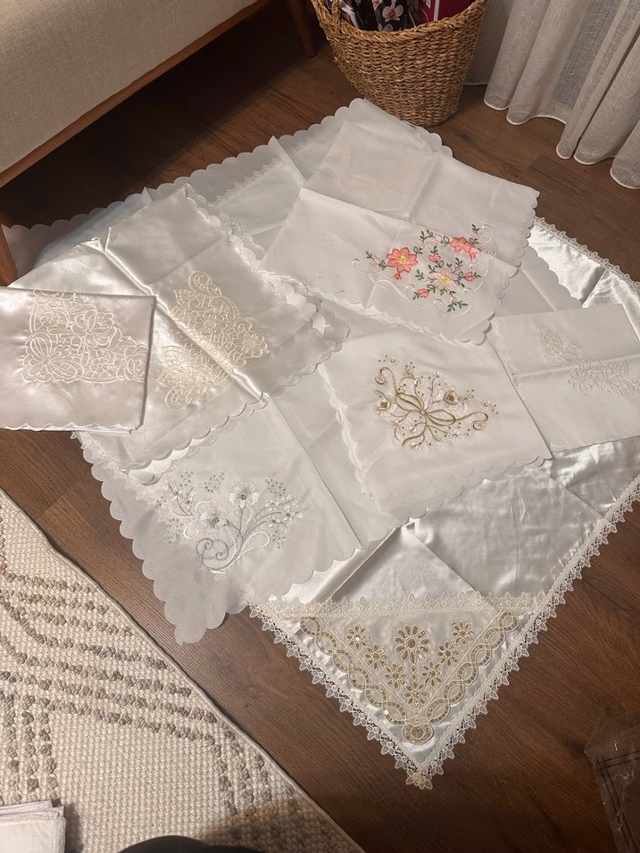 3 tanesi saten, 4 tane kumaş bohça örtüsü. Yine çok ucuza koyuyorum. El işi göz nuru olanlar var. Birtek pembeli olanın kenarında hafif bir leke bar fotoğrafta görünüyor çok küçük. Hepsi sıfır ürün. Alanın bohçası taşsın diyelim :) Dolabıma beklerim taşınacağım için bir sürü çeyizlik ürünü ve kıyafeti ucuza satıyorum 7 adet fiyatıdır.