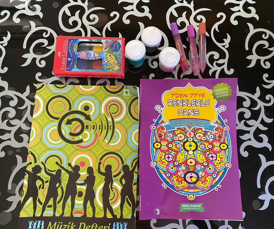 "7'den 77'ye Renklerle Dans" çocuk boyama kitabı, renkli çizimler ve etkinlikler içerir. Yanında müzik defteri,faber_castell suluboya ve boyama malzemeleri bulunur. Faber castell parmak boya yapıştırıcılar mevcuttur. Yenidir ve hiç kullanılmamıştır. Yanında hediyesi ile birlikte gönderilecektir. Alana şimdiden hayırlı uğurlu olsun.