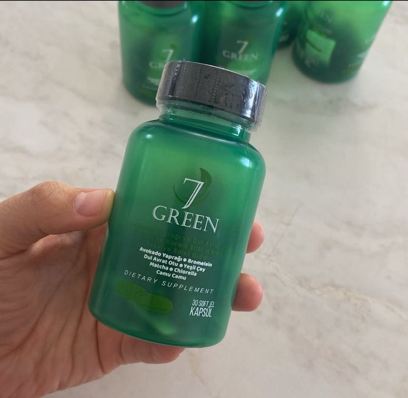 7 Green kapsüller, avokado yaprağı, biberiye, zeytinyağı, yeşil çay, matcha, chlorella ve kamelya içerir, saç sağlığını destekler.