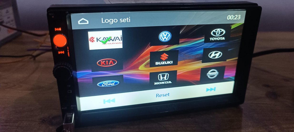 Honda, Kia, Suzuki, Volkswagen ve Ford gibi markaların logolarını içeren çoklu araç logo seti. Ekranda reset seçeneği bulunur.