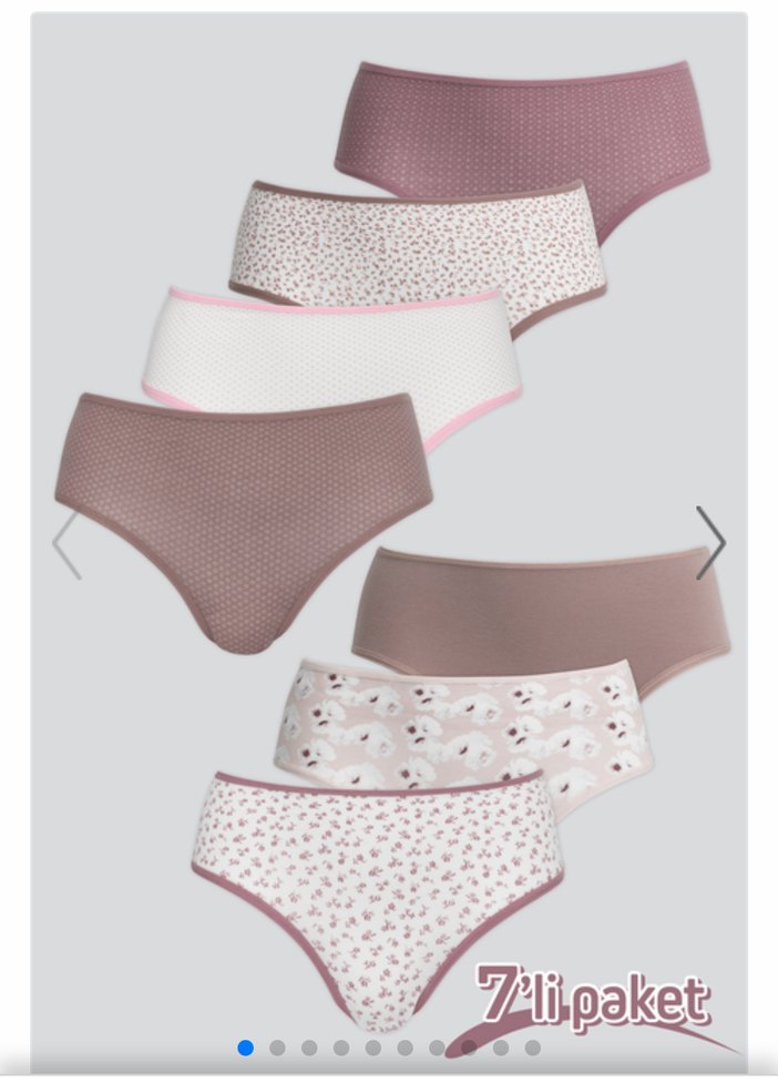 Yedi adet kadın midi uzunlukta külot seti, açık ve rahat tonlarda, düz ve hafif desenli seçeneklerle. Günlük kullanım için uygundur.