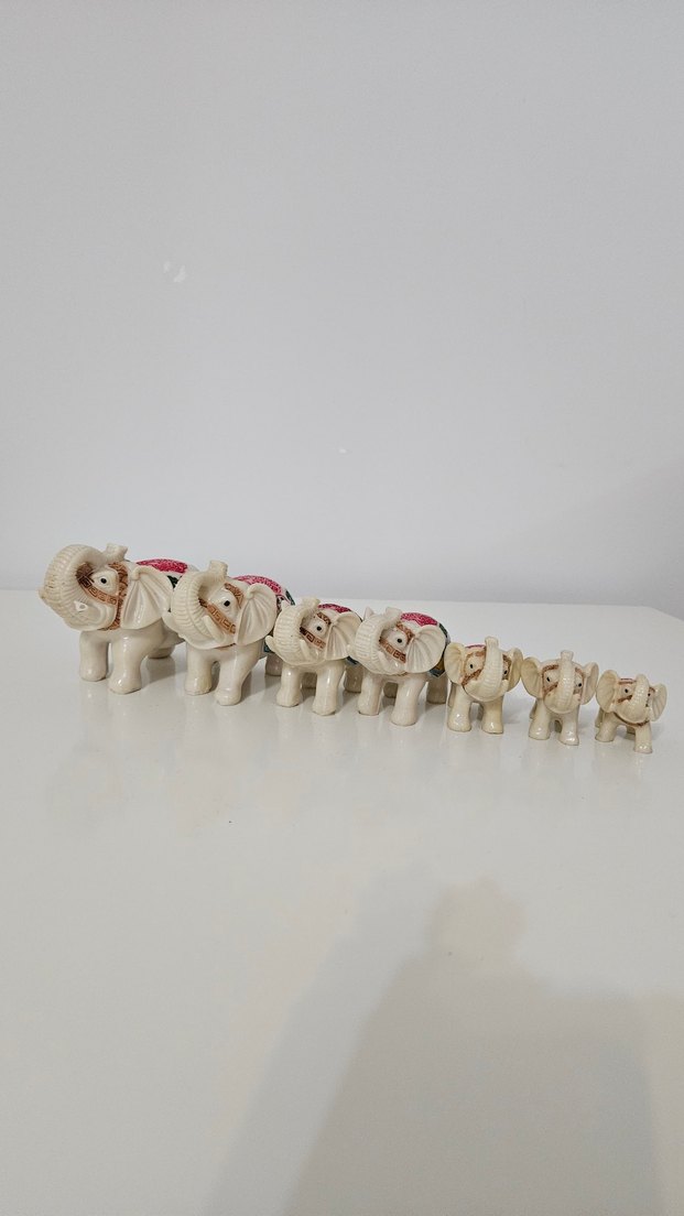 Farklı boylarda beyaz fil figürinlerinden oluşan set, kırmızı detaylarla süslenmiş. Fillerin birinde ufak bir kırık var. (son fotoğraf) Onun dışında hiçbir kusuru yoktur. Hiç kullanılmadı.