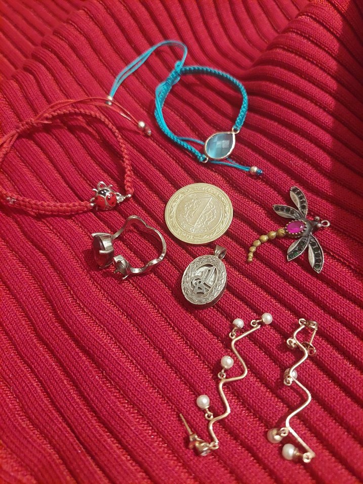 Ürünler 925 ayar gumustur.7 parça set şeklinde satılıktır. 1 adet incili küpe rose renk minik inci detaylı hiçbir sorunu yok kullanmadığım için koydum 1 adet yusufcuk kolye midyat gumusu yakut ve zumrut taşlı sadece takma aparatı düşmüştü yenisi taktirilabilinir onun dışında sorunu yoktur 1 adet yüzük ağır gramajli bir minik taşı düştü çok güzel bir yüzük her parmağa uyar kendinden ayarlayabilirsiniz lal taşı onu. Dışında bir kusuru yok 1 adet ayetel kursi kolye ucu takma aparatı eğilmiş onun dışında hepsinde kararma mevcut 2 adet bileklik mavi olan akuamarin taşı ve uğur böceği her bileğe uyar ipleri sağlam ama biraz kullanıldığı için değiştirebilirsiniz iade almıyorum kullanmadığım için satıyorum markası temsilidir pandora değildir. SON FIYATIM TEŞEKKÜRLER