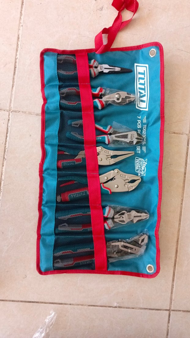 Mavi renkli, çok bölmeli alet düzenleyici. Mesh cepler ve rulo tasarımı ile çeşitli el aletlerini güvenle tutar.