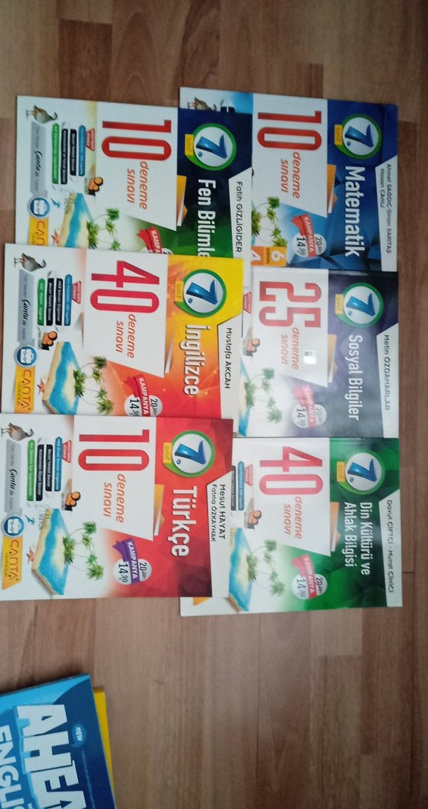 7. sınıf için Matematik, Fen Bilimleri, İngilizce, Sosyal Bilgiler ve Türkçe konularını içeren deneme sınavları seti. Her kitap çok sayıda test içerir. sadece din kültüru biraz çözüldü onun dışında hepsi yeni