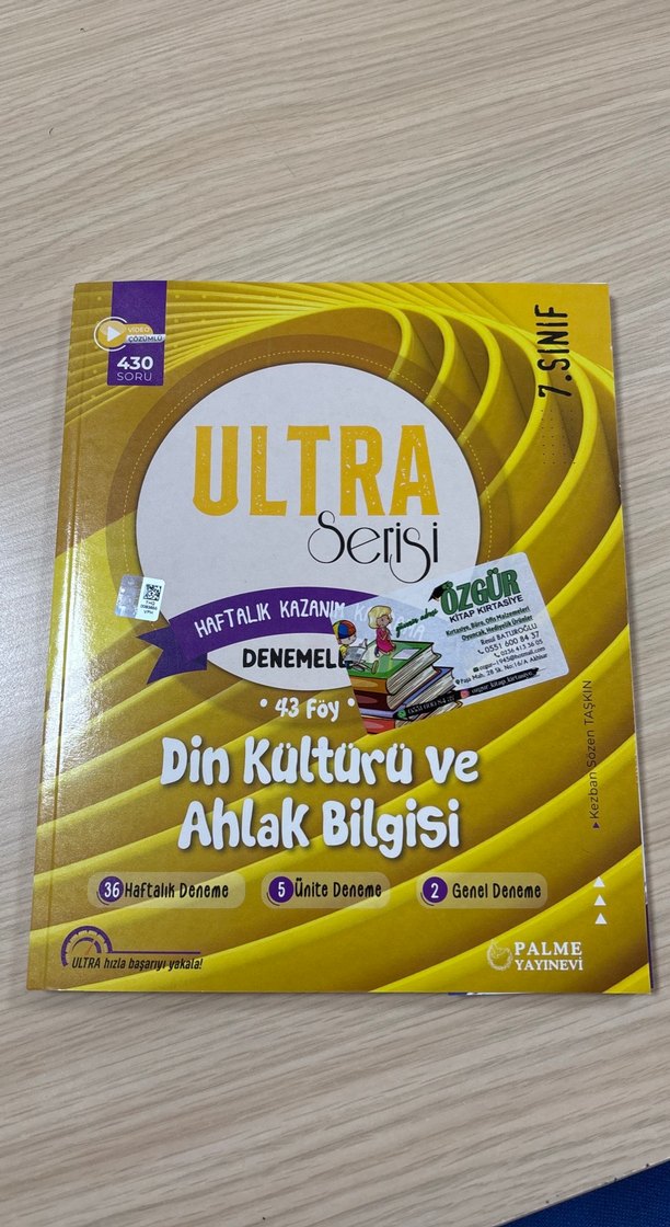 7. sınıf Din Kültürü ve Ahlak Bilgisi dersi için 430 soruluk, 36 haftalık, 5 ünite ve 2 genel denemeden oluşan sınav kitabı.