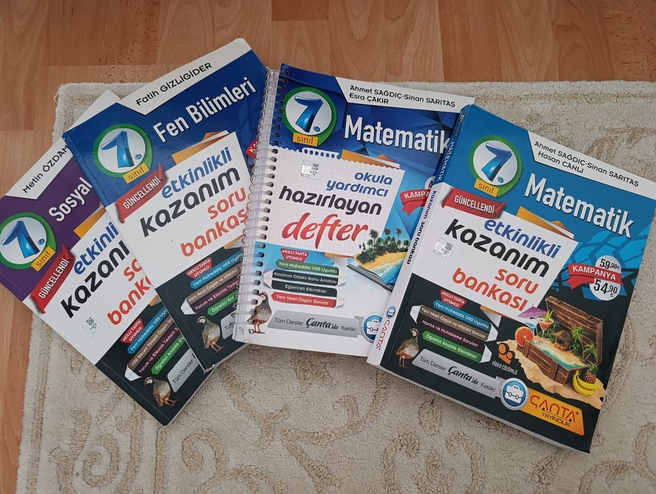 7. sınıf Matematik, Fen Bilimleri Sosyal Bilgiler için güncellenmiş soru bankaları ve okul destekli etkinlikli defter seti. 4 kitap sıfırdır. Çanta Yayınları
