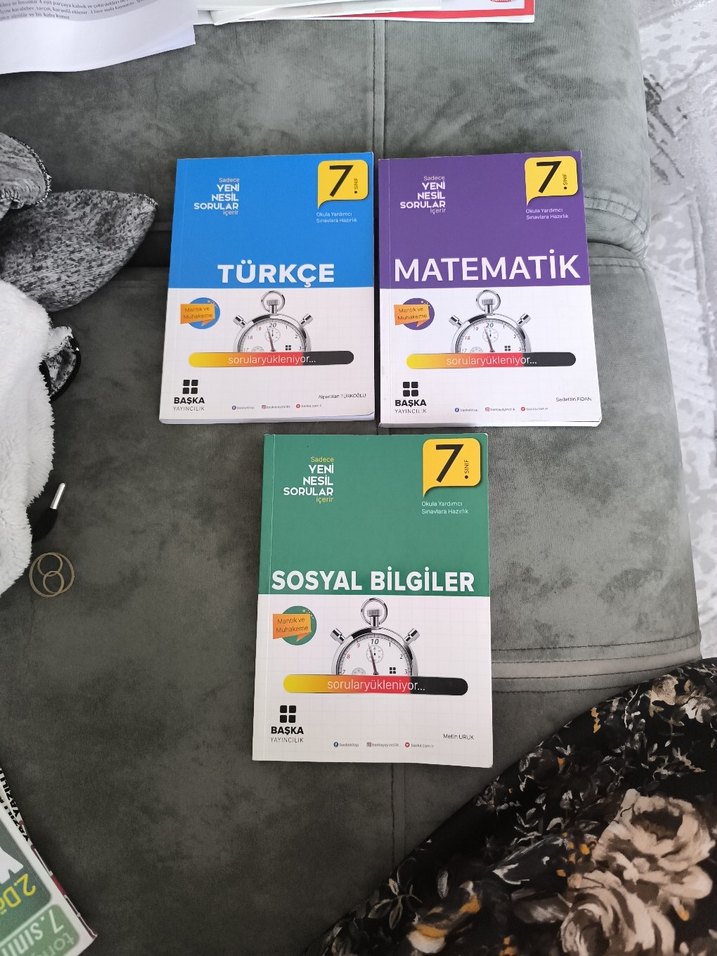 7. sınıf Türkçe, Matematik ve Sosyal Bilgiler derslerine yönelik yeni nesil sorular içeren sınav hazırlık kitapları seti. Türkçe ve matematik hiç kullanılmamış sosyal bilgilerin baş taraflarında işaretlemeler var