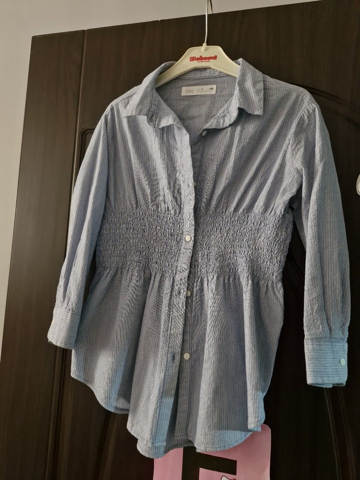Gri kumaştan, uzun kollu, düğmeli, yakalı ve bel kısmı büzgülü, normal midi boyda rahat kesim çocuk gömlek. iki kere giyildi temiz ürün