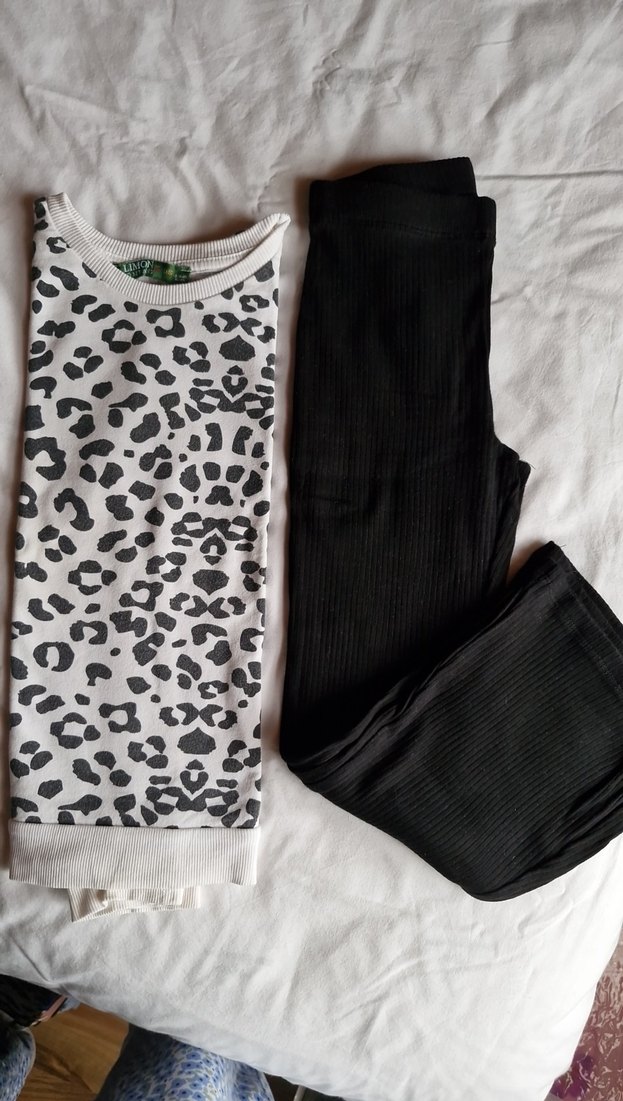 Genç Kızlar İçin Gri Pamuklu Sweatshirt ve Siyah İspanyol paça tayt Gri pamuklu, bol kesim, uzun kollu sweatshirt ve siyah ribanalı eşofman takımı. Sweatshirt, bisiklet yaka ve şık leopar desenlidir.