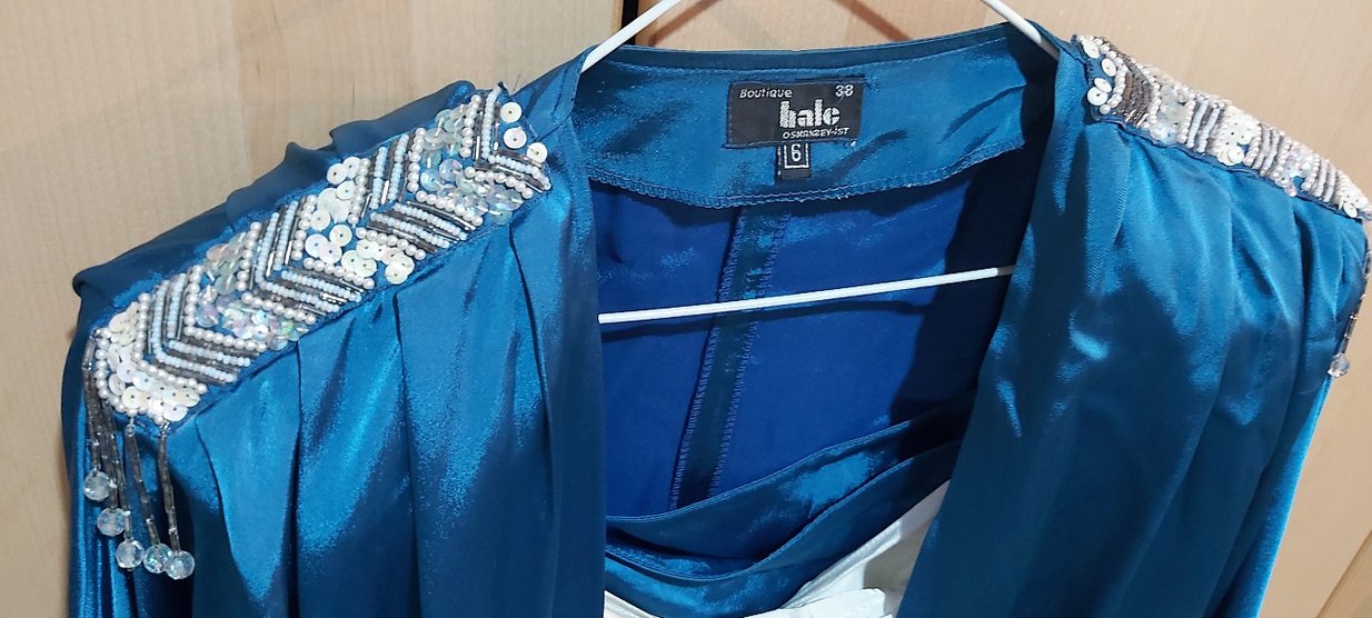 70 ler vintage..Parlak saten mavi beyaz kumaştan, nakışlı boncuk işlemeli detaylara sahip, vatkalı 3 lü abiye takim ✨