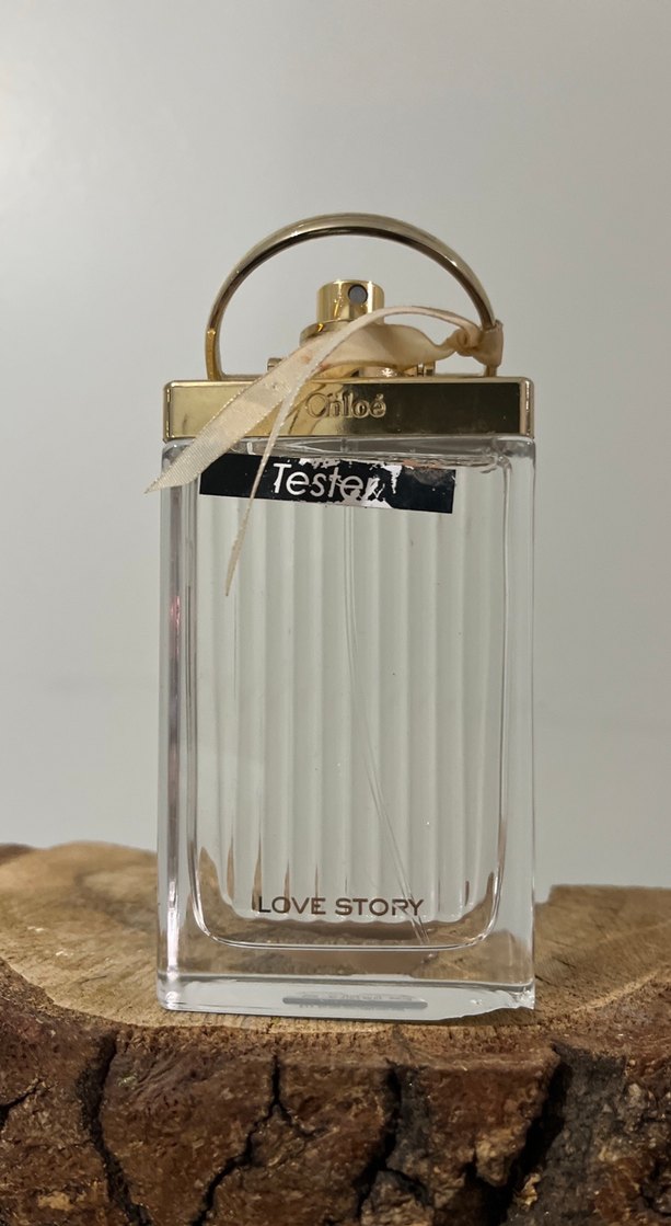 Chloé Love Story parfümü, altın kapaklı ve ince kurdeleli şeffaf cam şişede sunulur. Test ürünüdür. 75 milim kapaksız
