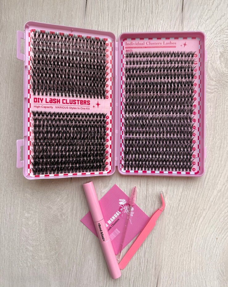 Açık pembe takma kirpik kümeleri, pembe aplikatör ve yapıştırıcı içeren set, kolay uygulama sağlar. Görünümünüzü kişiselleştirmek için ideal. ️