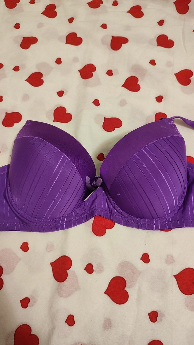 Mor renkli, çizgili dokulu ve ortasında küçük fiyonk detaylı sütyen. Normal uzunlukta ve minimalist tarzda.