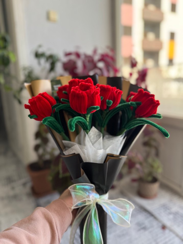 Kırmızı renkli kumaş güllerden oluşan, yeşil yapraklı ve şeffaf kurdeleyle süslenmiş dekoratif vazolu buket. İ G; Kristall.Flowers