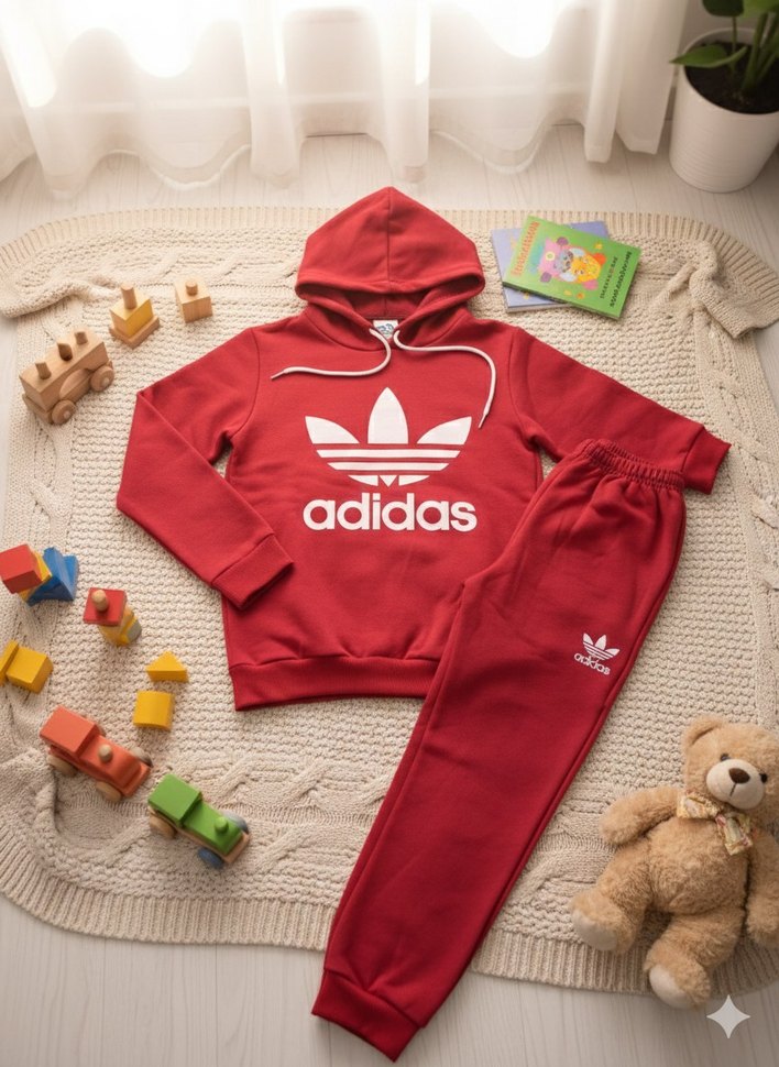 Kırmızı renkte, kapüşonlu sweatshirt ve bol kesim pantolonlu Adidas eşofman takımı. Yumuşak ve sıcak kumaştan, renkli baskılı logo ve örme detaylara sahip.