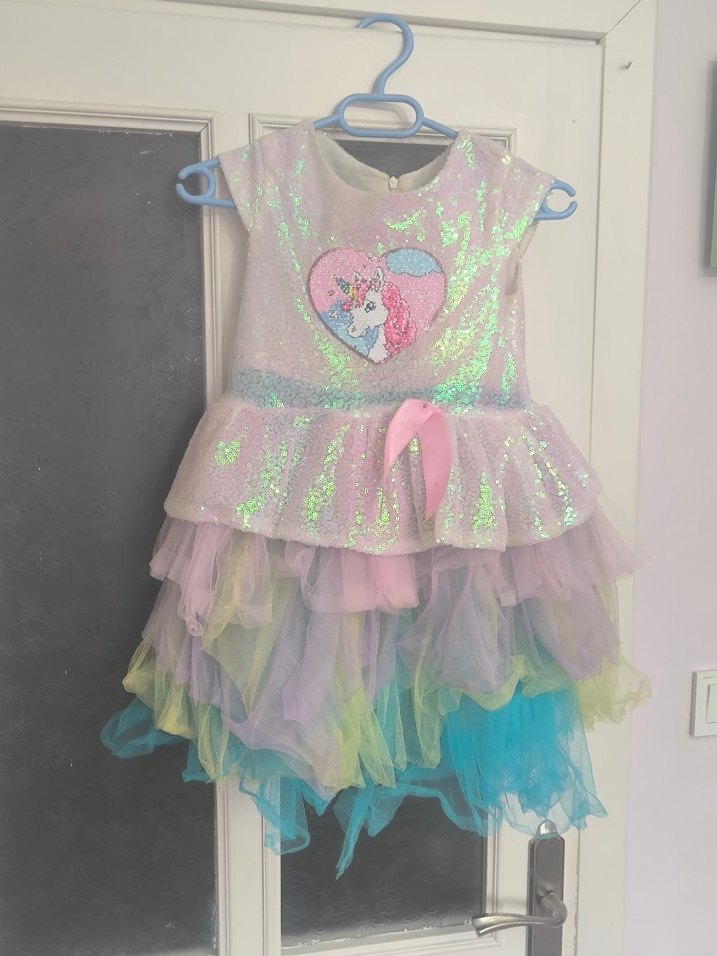 8-9 yaş Kız çocuklarına özel, çok renkli, payetli ve askısız tasarımlı elbise. Kat kat fırfırlı etek ve unicorn baskısı ile dikkat çeker.