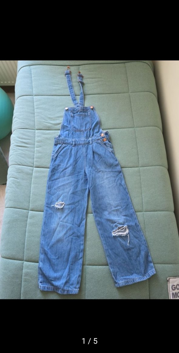 Mavi kot kumaştan, midi boy ve salaş kesim tulum. Askılı, kemerli ve yırtık detaylı, günlük rahat stil için uygundur.