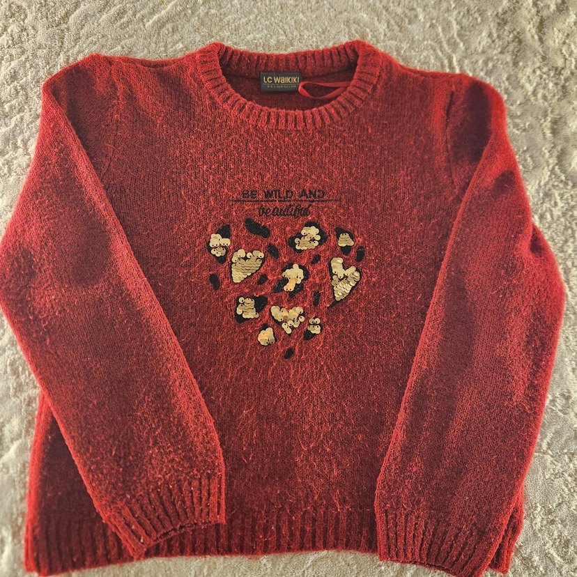 8-9 yaş LCW bordo önü pullu nakışlı kız çocuk kazak