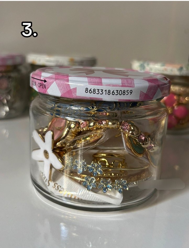 Altın tonlu, çiçek ve taşlı detaylara sahip pastel pembe tırnak süslemeleri içeren kavanoz.