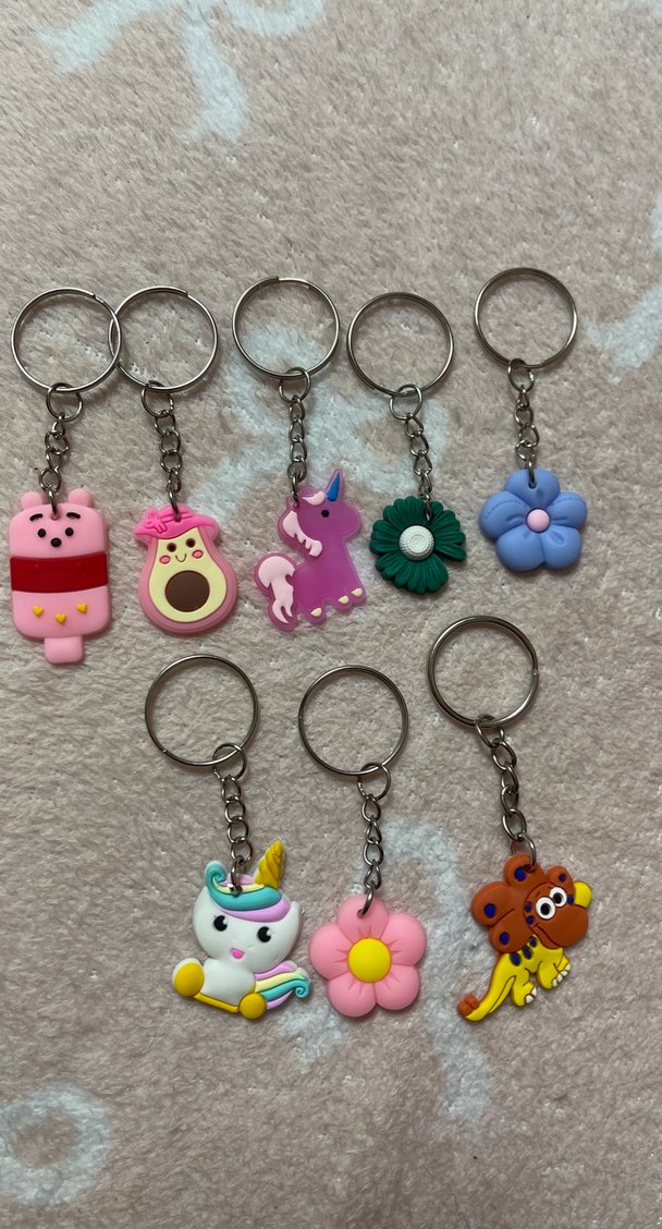Popsicle, avokado, tek boynuzlu at, çiçekler, gökkuşağı tek boynuzlu at ve dinozor gibi boncuklu tasarımlara sahip renkli anahtarlık seti.