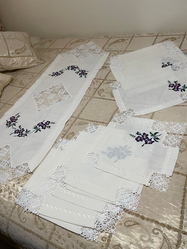Kanebiçe ve dantelle gardenya kımaş üzerine runner 8 servis peçetesi 8 amerikan servis ile 17 parçadan oluşmaktadır