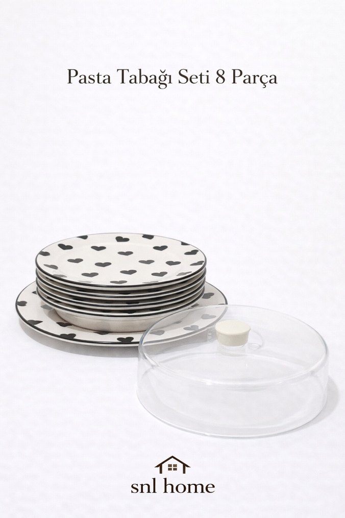 8 parçadan oluşan beyaz pasta tabağı seti, gri kalp desenli ve koruma için şeffaf kapaklıdır. Tatlı sunumu için uygundur.