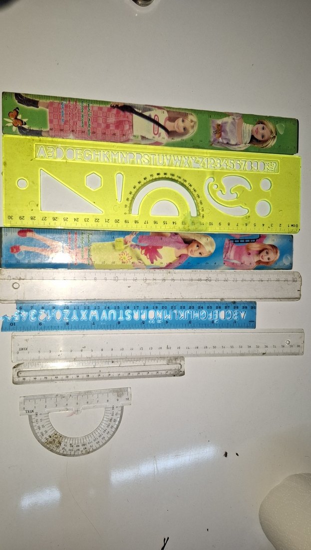 Çok renkli cetveller ve açıölçer içeren, alfabe ve şekil şablonlu okul seti.