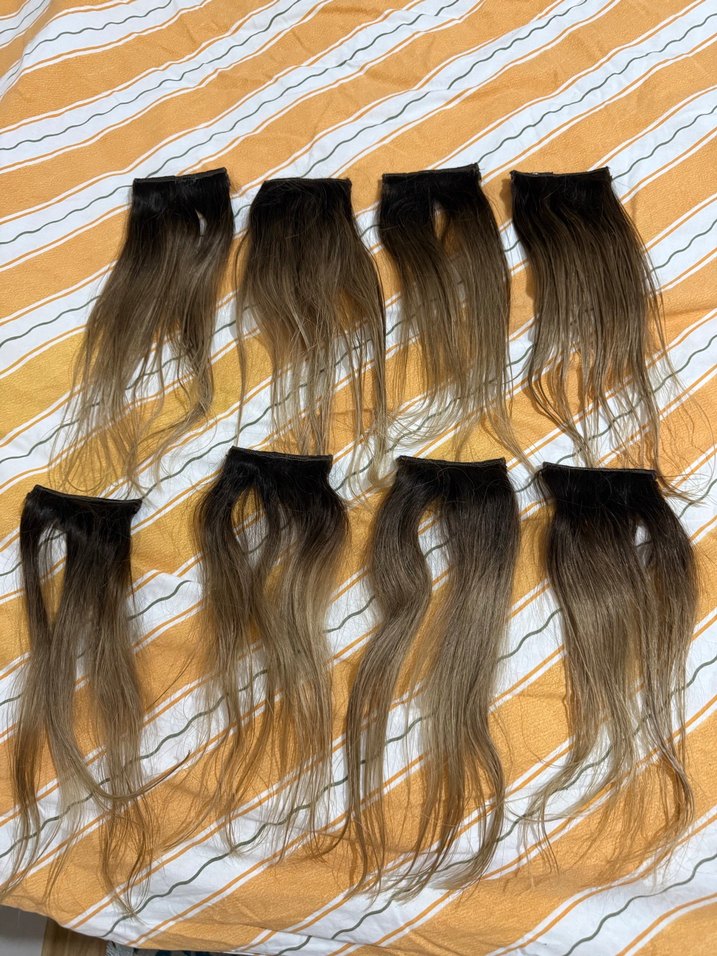 Ombreli 8 parça çıt çıt saç boyunu tam bilmiyorum ama uzun değil boya maşa fön yapılır gerçek saç