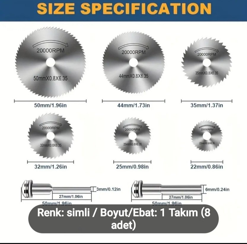 8 parçalı 50mm 32mm'den 44mm'ye kadar boyutlarda, 20000 RPM hız için uygun, 8 parçalı,Matkapa bağlı Testere bıçakları. Ahşap,Plastik,Metal,Bakır,Aleminyum kesmektedir.