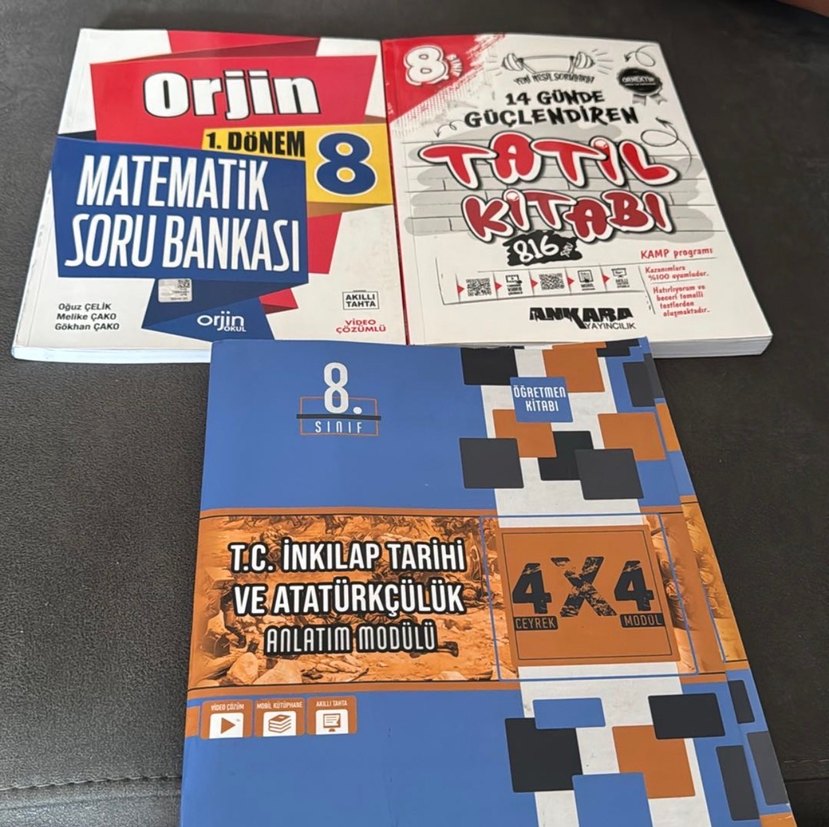Orjin 8. sınıf matematik soru bankası, 8. sınıf tatil kitabı ve T.C. İnkılap Tarihi ve Atatürkçülük anlatım modülü seti.