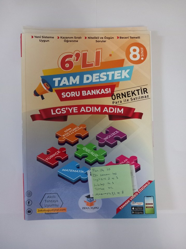 8. Sınıf 6'lı Tam Destek Soru Bankası. Zeka küpü yayınları. Türkçe Kitabı bulunmamakla beraber diğer 5 dersin kitabı az kullanılmıştır. Kitaplardaki yapılan test numaraları ilk fotoğrafta yazmaktadır.