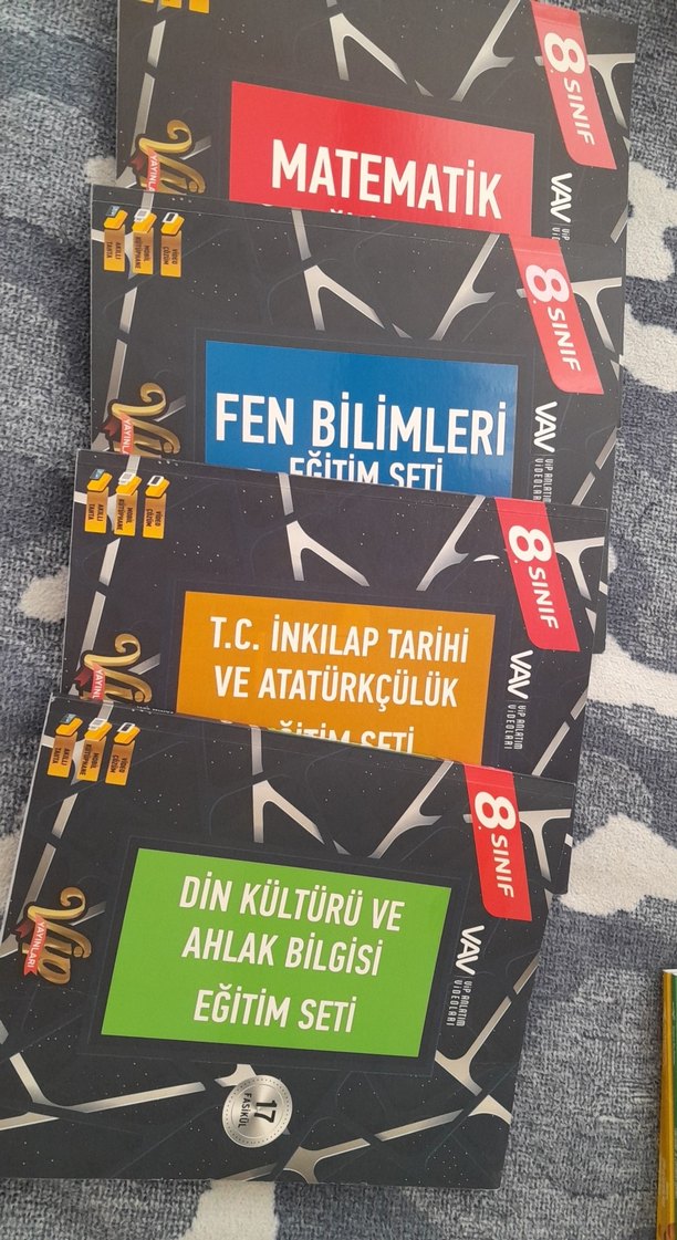 8. sınıf için Matematik, Fen Bilimleri, T.C. İnkılap Tarihi ve Atatürkçülük ile Din Kültürü ve Ahlak Bilgisi kitaplarından oluşan eğitim seti. Fen bilimleri ve Matematikten sadece 5 fasikül çözülü inkılap sadece 4 fasikül din ise sadece 2 fasikül çözülü konu anlatımlı,etkinlikli vip yayınları eğitim fasikülü.