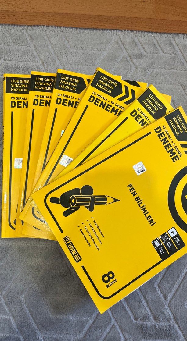 8. sınıf fen bilimleri alanında lise giriş sınavına hazırlık için Hız Yayınları tarafından hazırlanmış deneme kitapları sıfırdır sadece son eklediğim mat 1 deneme fenden 3 deneme yok