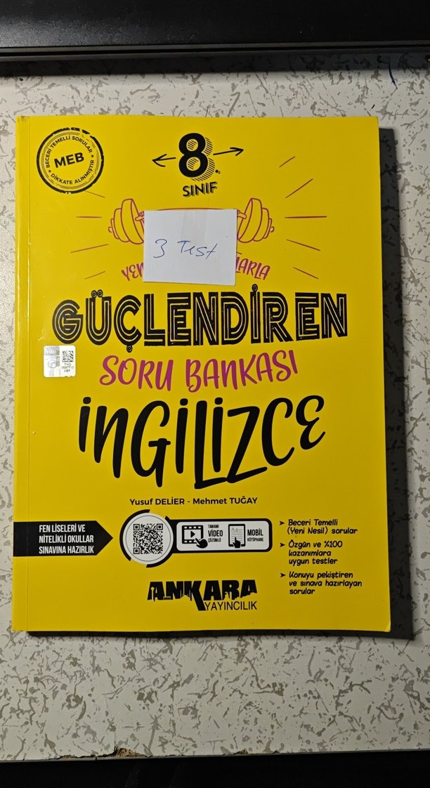 Ankara Yayıncılık 8. Sınıf İngilizce Güçlendiren Soru Bankası. Millî Eğitim Bakanlığı Maarif Modeli’ne uygun, güncel müfredata göre hazırlanmıştır. Güncel baskı olup yalnızca 3 test çözülmüştür; kitap çok temiz durumdadır. Kaliteli, güvenilir ve sınav odaklı kaynak arayanlar için ideal bir tercihtir.
