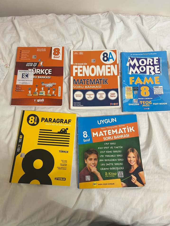 8. sınıf matematik ve Türkçe soru bankalarından oluşan set. Fenomen, Fame, Uygun ve Paragraf gibi kitapları içerir, sınavlara hazırlık için uygundur. Tek almak için yazınız. USTA İŞİ VE UYGUN KALDI SADECE