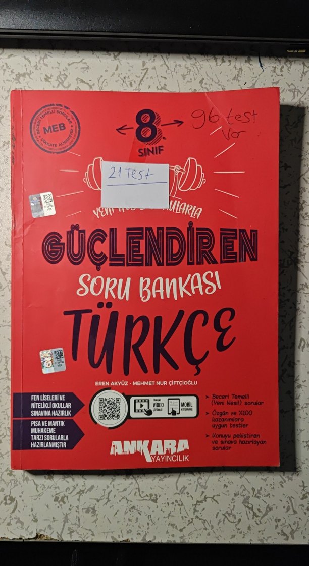 Ankara Yayıncılık 8. Sınıf Türkçe Soru Bankası. Millî Eğitim Bakanlığı Maarif Modeli’ne uygun, güncel müfredata göre hazırlanmıştır. Kitap toplam 96 testten oluşmakta olup 21 test kurşun kalemle çözülmüştür. Kaliteli ve güvenilir kaynak arayanlar için ideal bir tercihtir.
