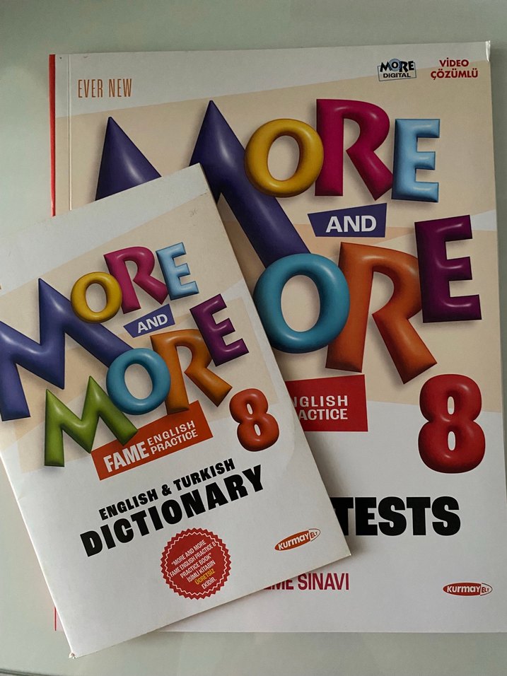 8. sınıf için İngilizce ve Türkçe sözlük ile birlikte video çözümlü test kitabı içerir. more and more