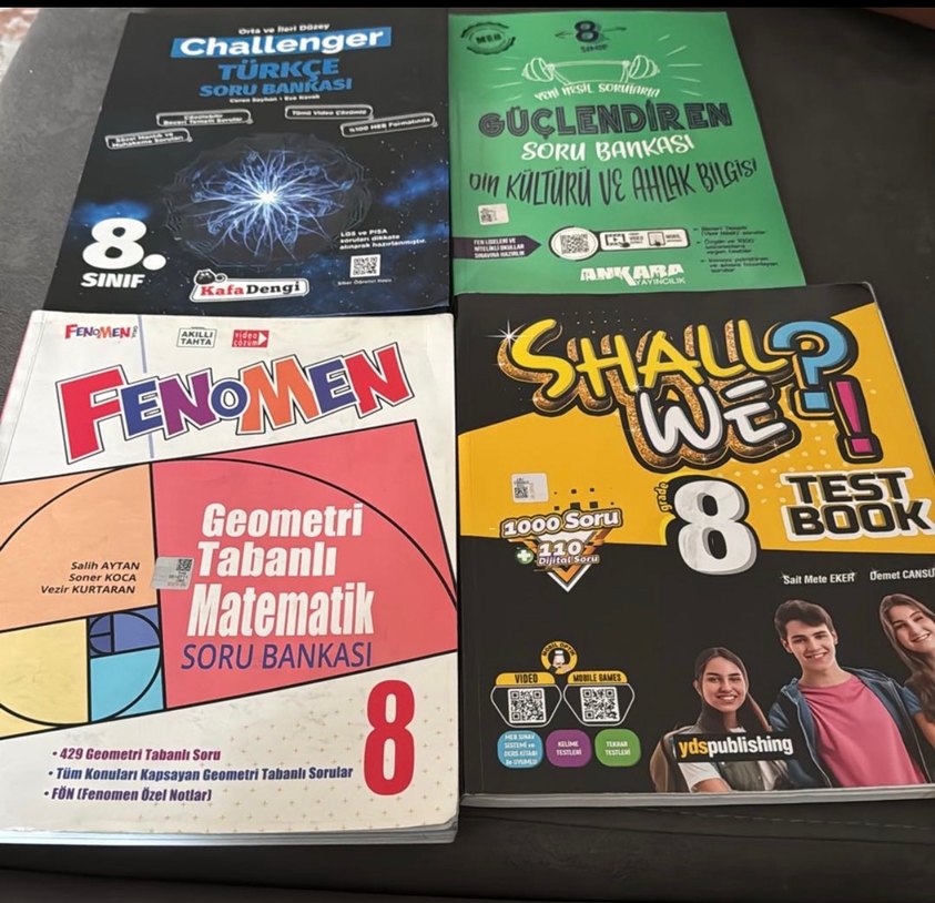 Türkçe, geometri tabanlı matematik, kültür ve ahlak bilgisi ile genel soruları içeren 8. sınıf sınav hazırlık kitapları seti. Çözülmüş sayfaları var