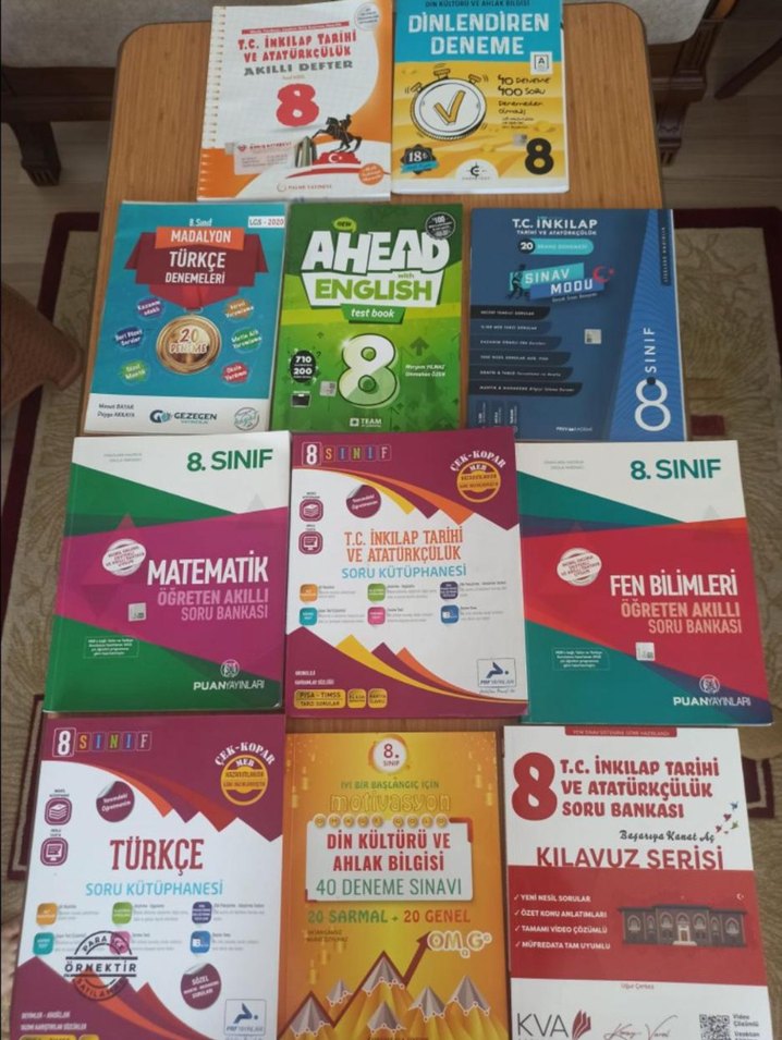8. sınıf için Türkçe, İngilizce, Matematik, Fen Bilimleri ve Din Kültürü soru bankaları ile deneme sınavları seti.