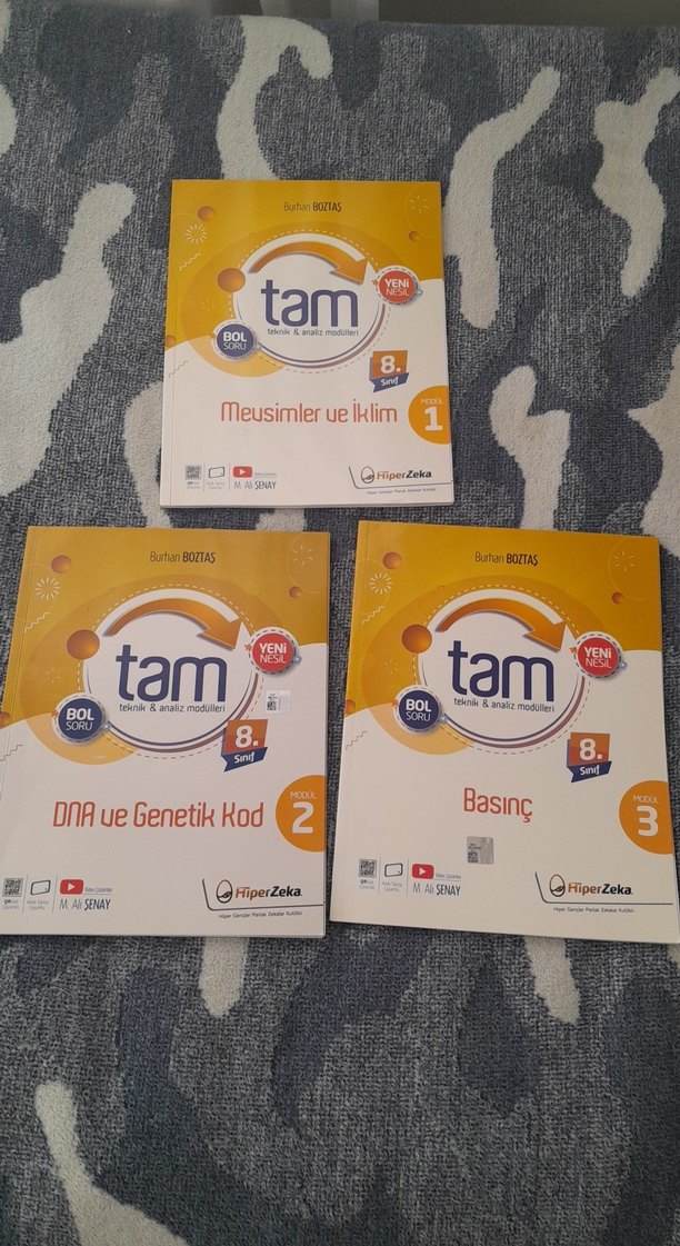8. sınıf için fenden Mevsimler ve İklim, DNA ve Genetik Kod, Basınç konularını içeren üç tam soru bankası kitabı seti. Bol soru ve cevap içerir. matematik kareköklü ifadeler konusundan türkçede fiilimsiler ve cümlenin ögeleri konusundan fasikül hiç çözülmedi
