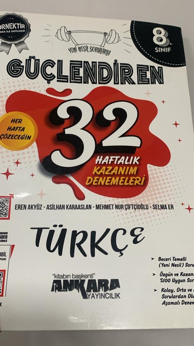 8. sınıf için 32 haftalık beceri temelli, yeni nesil kolay ve orta zorlukta Türkçe kazanım denemeleri kitabı.