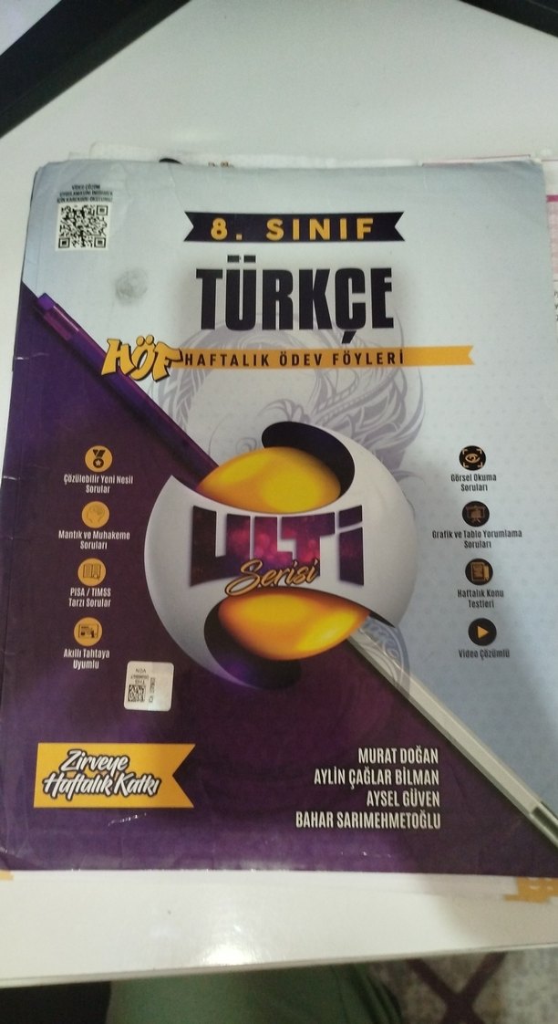 8. sınıf için hazırlanmış haftalık ödev föyleri içeren Türkçe çalışma kitabı. Çoktan seçmeli, mantık ve okuma soruları ile video çözümleri bulunur. 5 6 haftası eksiktir bazı sayfaları doludur.